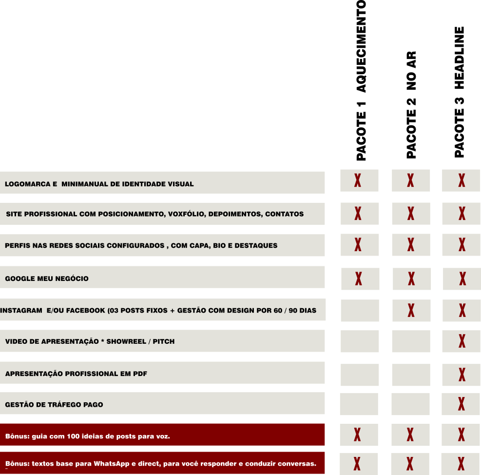 Cada pacote foi pensado para atender objetivos e momentos diferentes de carreira: do primeiro passo com uma vitrine profissional até a liderança do seu nicho com materiais premium. Você escolhe o nível de profundidade que precisa agora — e, quanto mais completo o pacote, maior o destaque e o posicionamento que sua voz conquista nas redes e nas buscas.